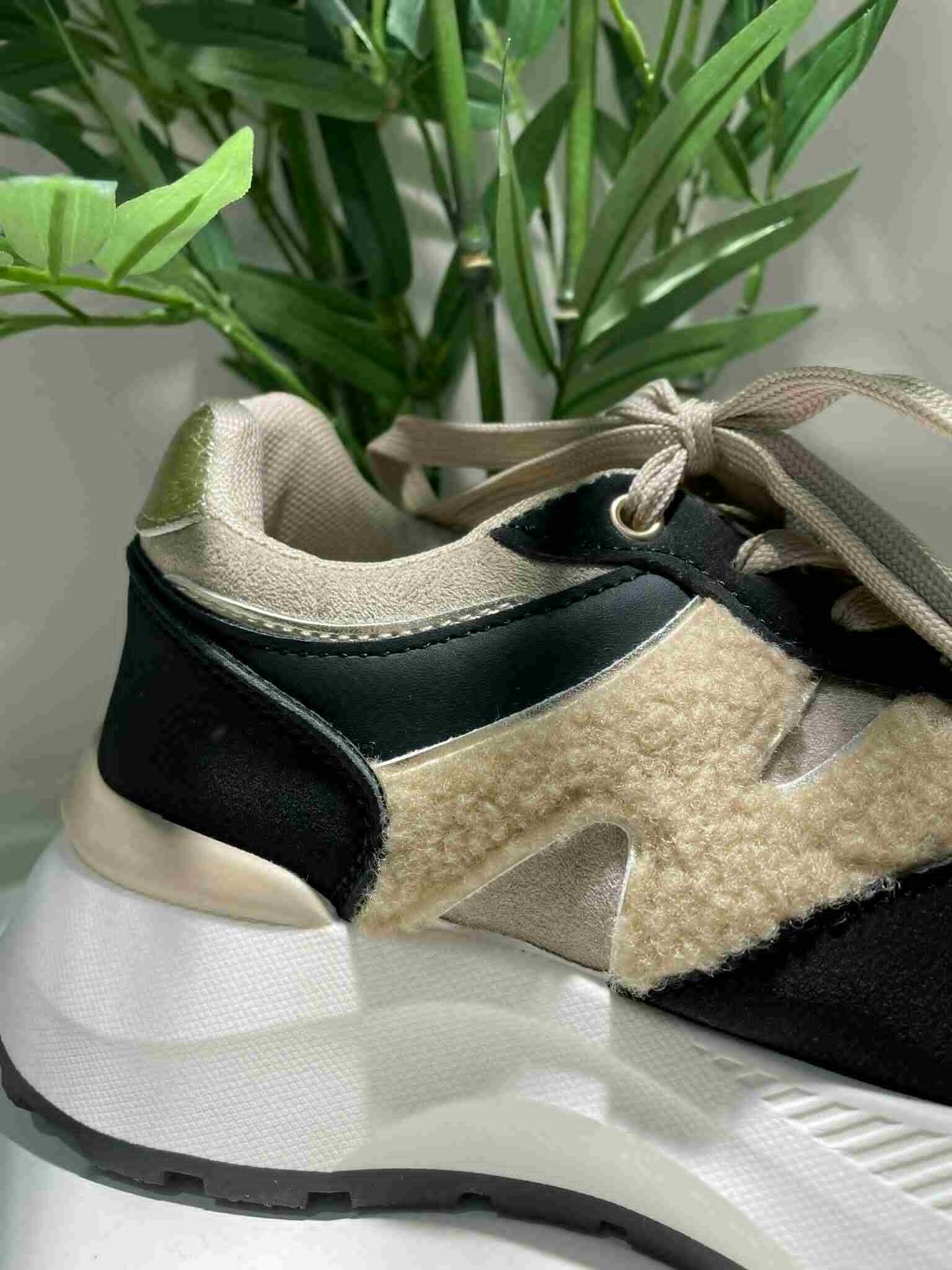 zwarte sneaker met beige en teddy ook aan de achterkant beetje goud